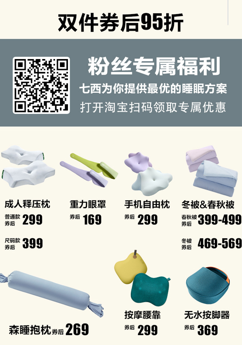 另外需要他们家「七西重力眼罩」优惠的听友们这次也可以关注一下,遮光性很好,内芯是重力珠,就是戴上之后会有点压感,通过微压刺激眼周穴位,帮助神经系统放松下来,但是不会给眼球造成不好的压力,就让人很有安全感,入睡很快。如果上次错过了他们家「七西枕头」,这次也可以趁机入手啦,购买双件还可以再享受双件券后95折扣有需要的听友们可以使用