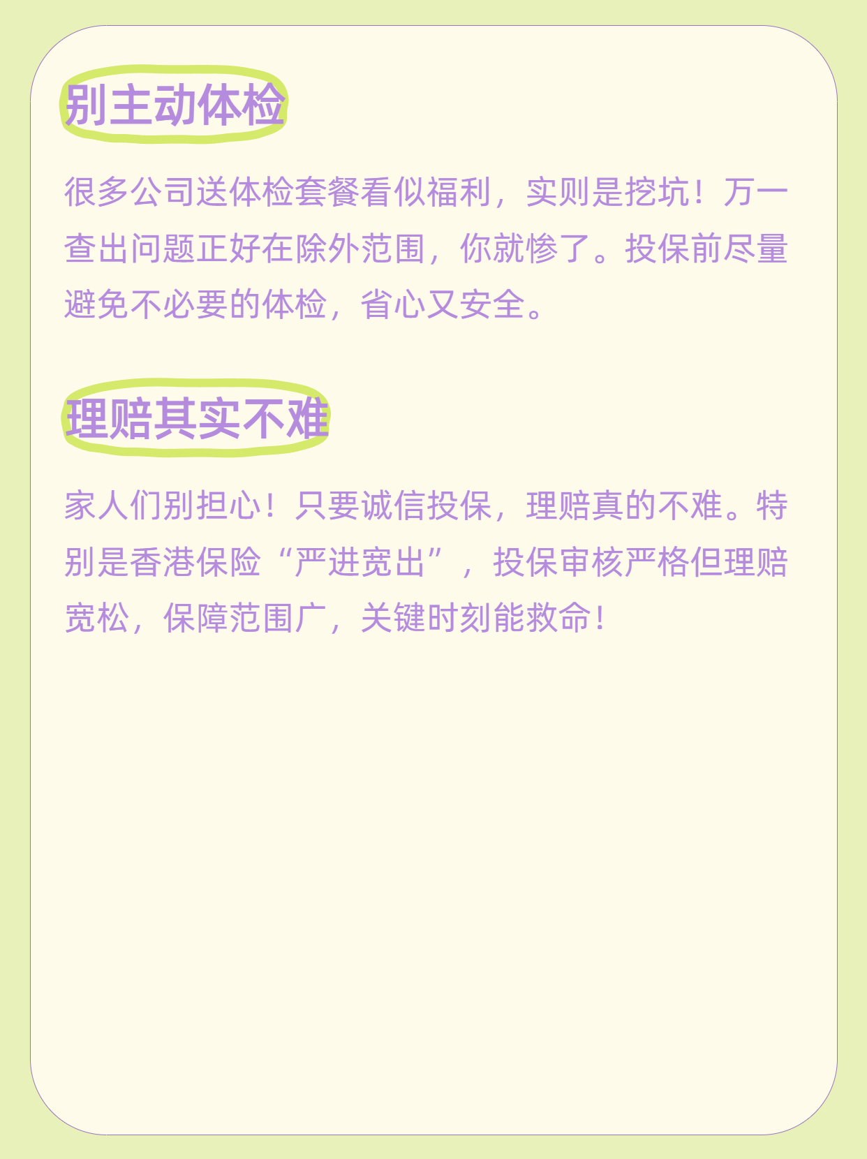建议3:别主动体检 �很多公司送体检套餐,看似福利实则挖坑!万一查出问题正好在除外范围,你就惨了